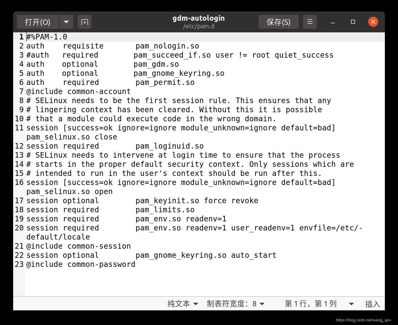 在终端输入命令:sudo gedit /etc/pam.d/gdm-autologin 打开文件