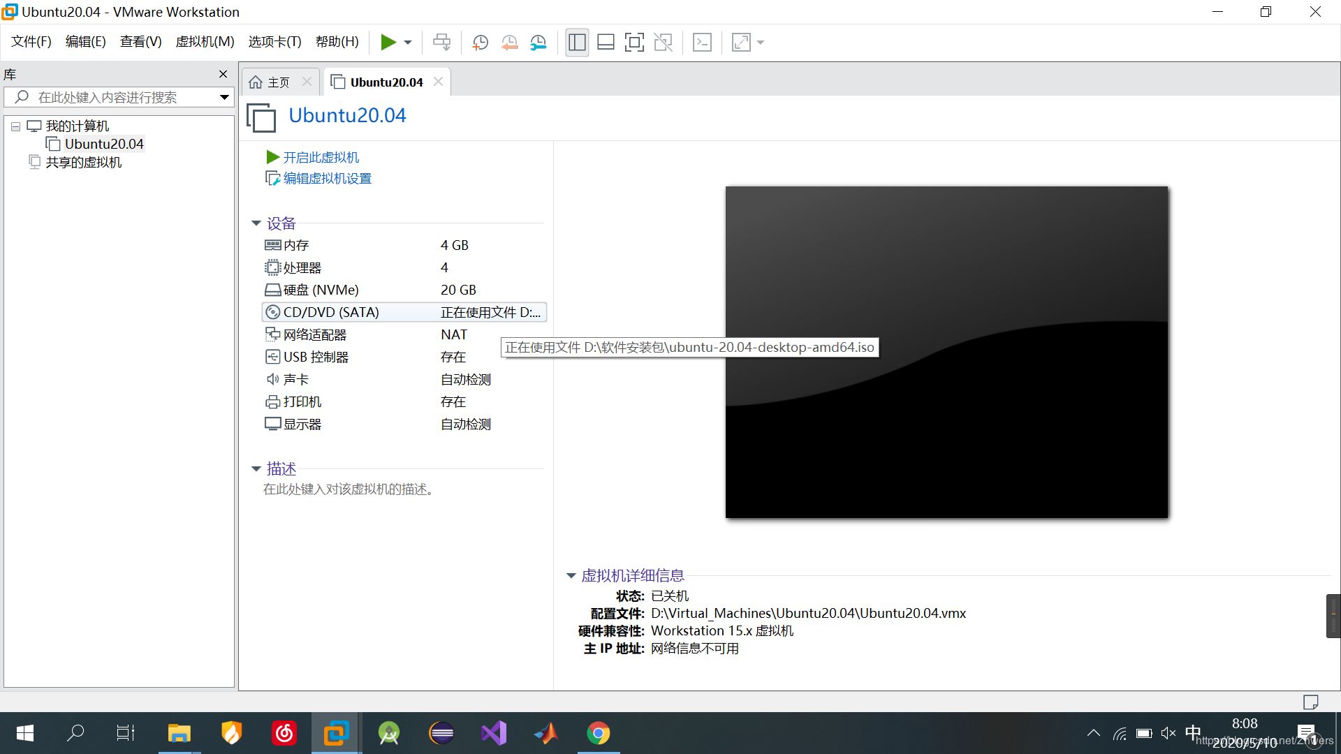 16、 选择“新CD/DVD(SATA)”,在右侧选择“使用ISO映像文件”,然后点击“浏览”,找到之前下好的Ubuntu20.04安装包。然后点击“关闭”