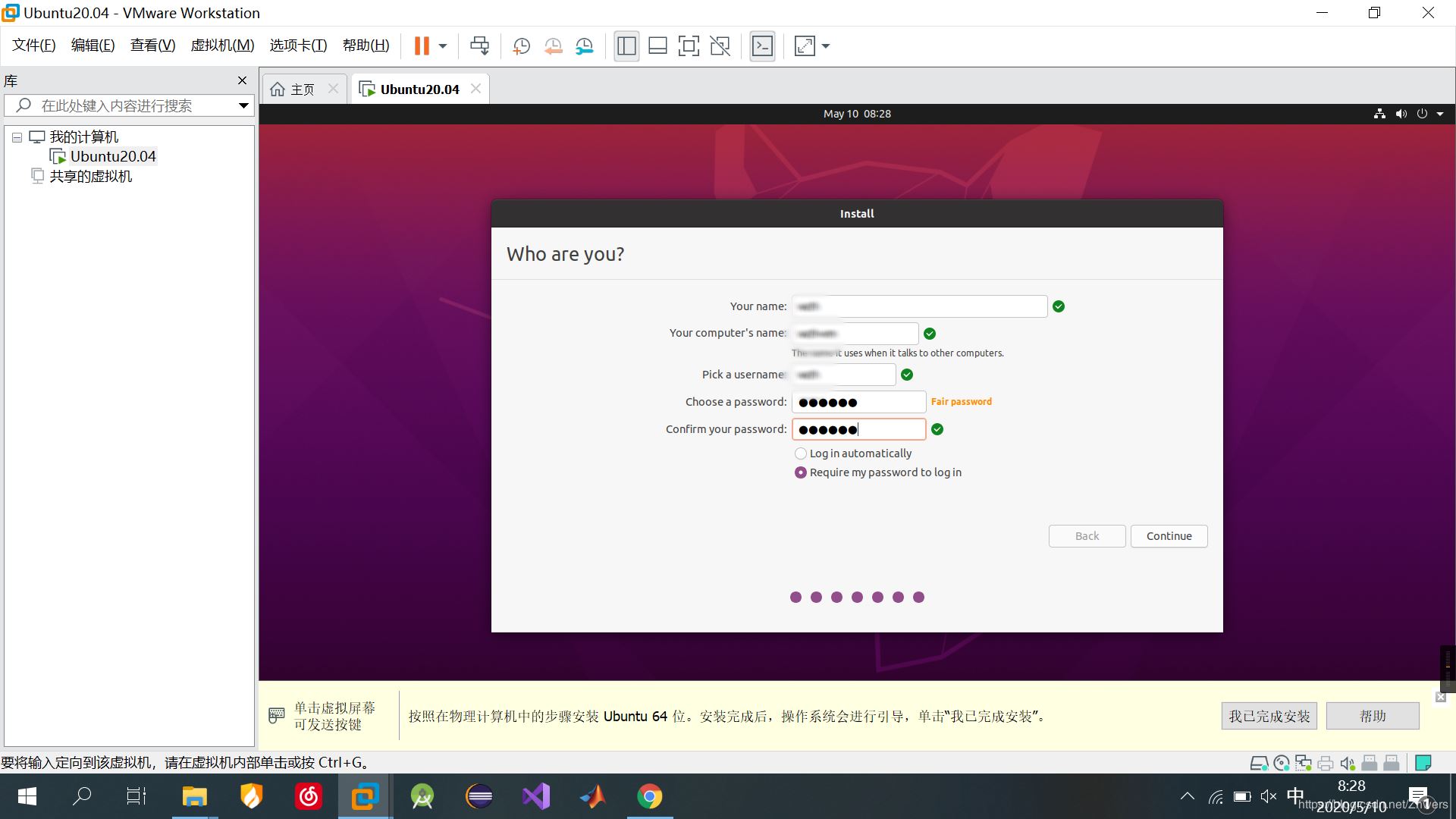6、输入用户名,虚拟机器的名称,然后输入密码、确认密码。都输入完了之后,就可以“Continue”