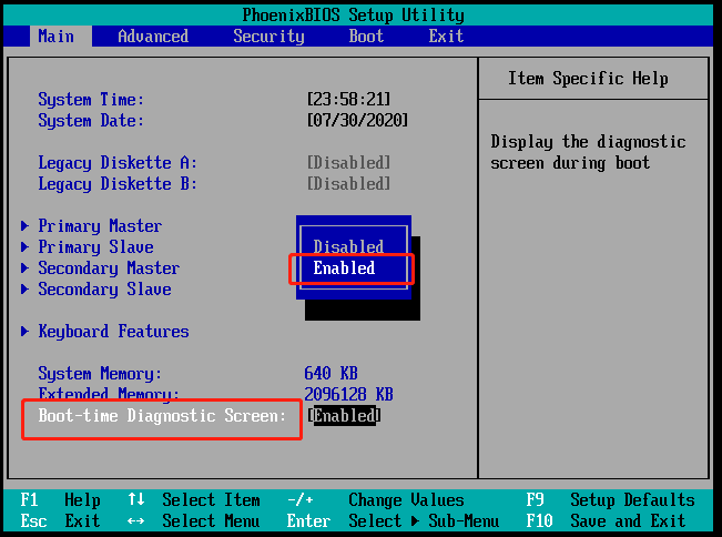 第二步:找到Main-最下面的Boot-time Diagnostic Screen,敲“Enter”,弹出菜单,通过↑↓键把它调整为“Enabled”。