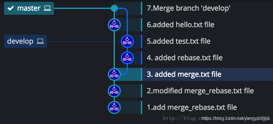 假设我们有如下图一所示仓库,该仓库有master和develop两个分支,且develop是在(3.added merge.txt file)commit处从master拉出来的分支。