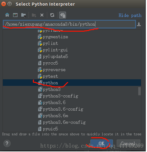 3.找到python文件,目录如图所示。目录中的xiexupang是笔者自定义的文件夹。找到anaconda3的安装包后,打开里面的bin文件夹,然后找到python文件,点击ok。如下图。