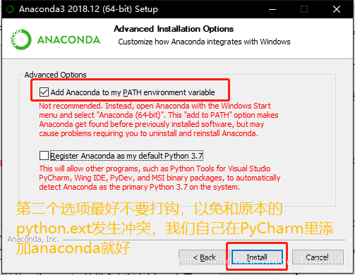 注意:这里建议第二个选项不要打钩(因为我们有可能平时使用的是默认的python.ext,这样会产生冲突),在需要的时候我们可以在pycharm中找到文件的安装位置进行添加即可,单击“Install”,之后便可进行安装,然后等待安装完成。