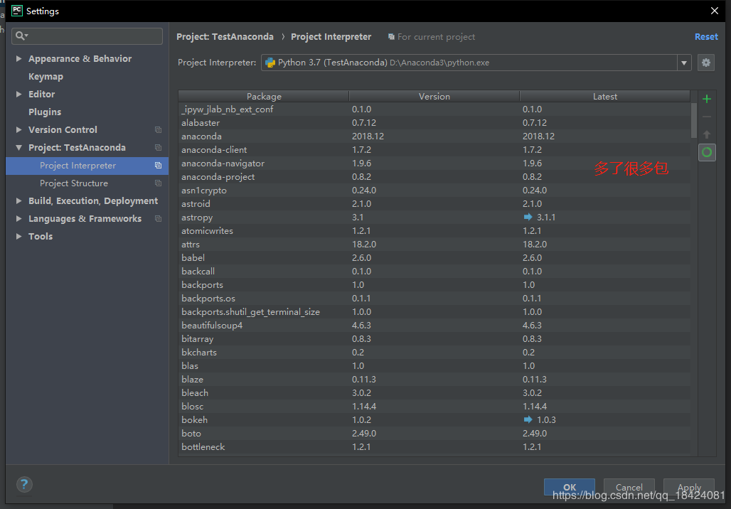 点击OK,就能看到Settings->Project Interpreter的页面多了很多包