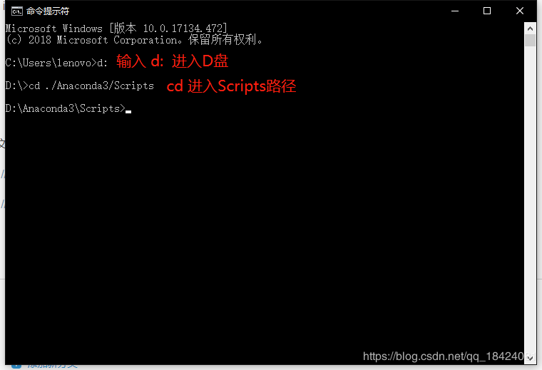 打开“cmd”窗口(快捷键win+R,然后输入“cmd”),将当前目录定位到anaconda的目录,记住要定位到其中的Scripts目录中,我的目录是“D:\Anaconda3\Scripts”,所以我定位到了这个文件位置。如下图: