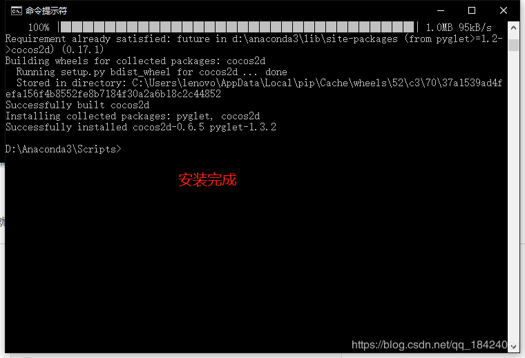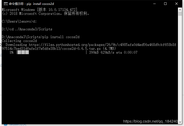 然后就可以使用pip进行安装了,记住这个pip是anaconda的pip工具(如果你装过python.exe的话,那么你的用户目录中的pip也是可以操作的,不过那里的pip就不是anaconda中的了,所以,请记住一定要切换到这个目录后进行pip安装),在这里我是使用了pip install cocos2d的命令进行了“cocos2d”这个包的安装,之后便是等待安装完成即可。