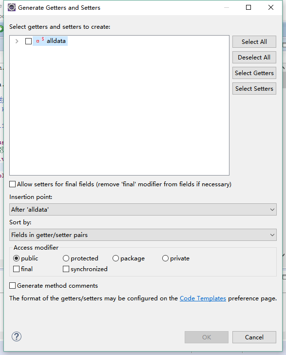 技巧:在eclipse中编写封装类,可以声明变量后,按shift+Alt+s键出现Generate Getters and Setters提示创建getter和setter方法。