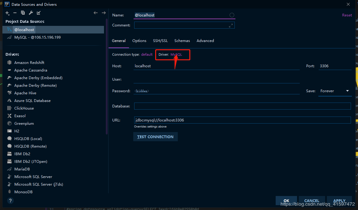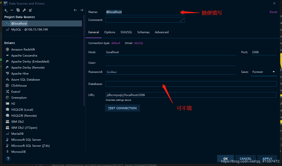 如果没有 Dirver 请下载 idea 会在窗口左下角给提示(这里具体在什么位置我也记不清楚)输入相关连接信息