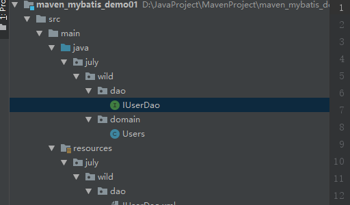 这个july.wild.dao.IUserDao.xml是我的配置文件目录,和我的IUserDao接口位置对应,你们在进行配置的时候也需要注意前后一致