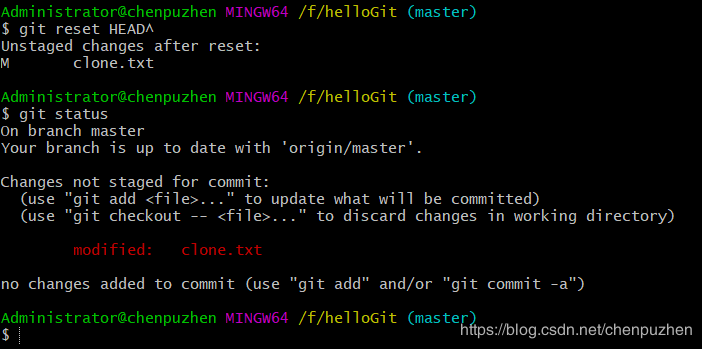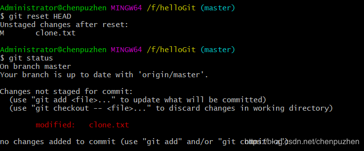 说明git reset HEAD操作只对暂存区起效果,不对工作区的内容起效果。所以我们要想修改掉工作区的内容还得继续执行命令进行还原。根据上面的截图提示,git add是添加,因为我们发现了错误才回退的,所以肯定不能执行这个了。