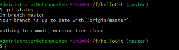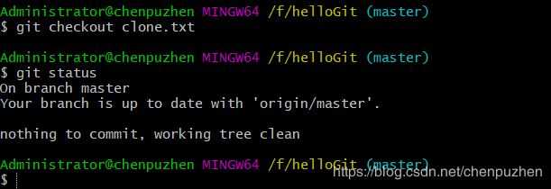 还有个命令提示:git checkout --<file> to discard changes in working directory这个意思就是下载某某文件,丢弃掉该文件在工作区的改变内容。姑且就这么翻译吧。就是把文件还原了,工作区的修改也没了。我们执行该命令查看状态,如图: