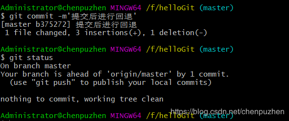 如图,我已经commit了,还没有push,push的内容我们先不管,push这个命令其实和提交没关系,他只是推送到远程了,如果push了,也就是我们回退了之后,再重新push一下而已,所以请不要纠结push这个操作。他和提交版本其实没有关系的。