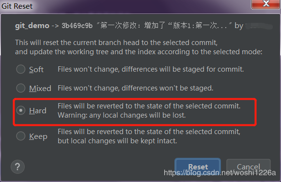 在弹出的git reset 参数类型选择框中,选择Hard(见下图),并Reset