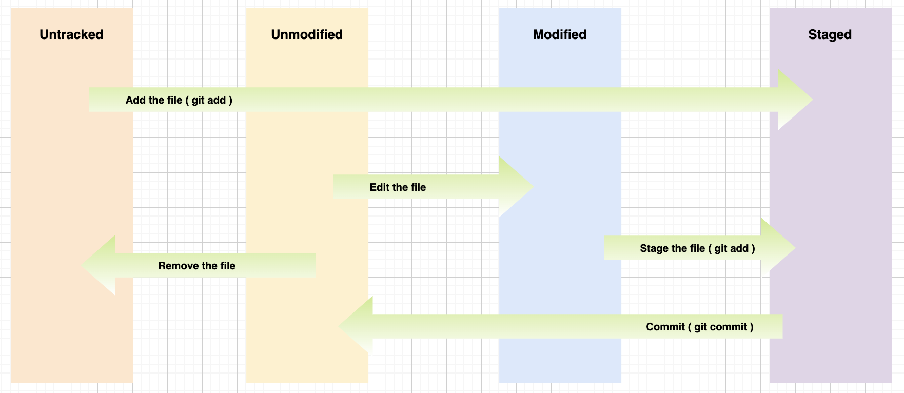 # 添加所有的修改到Staging区 git add . git add --all # 添加指定文件到Staging区 git add file # 添加多个修改的文件到Staging区 git add file1 file2 # 添加修改的目录到Staging区 git add dir # 添加所有src目录下main开头的所有文件到Staging区 git add src/main*