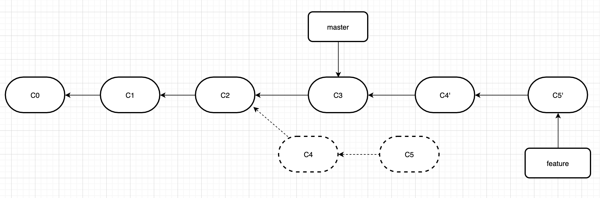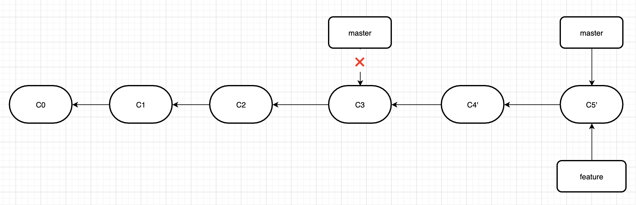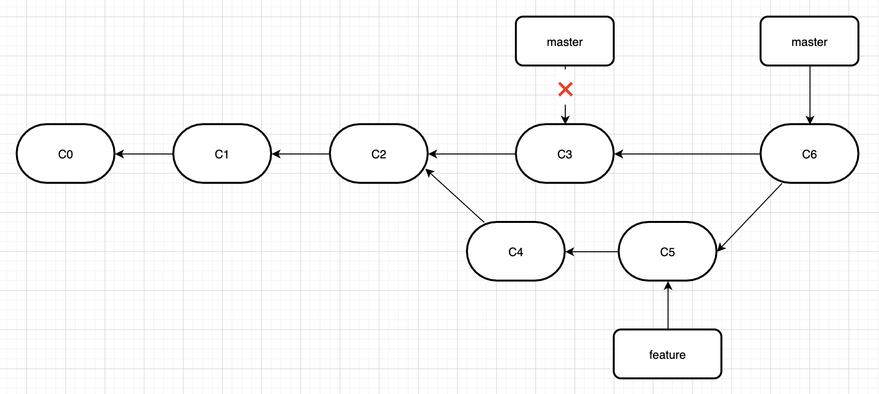 再举个栗子,假如初始存在feature和master分支情况是这样的。