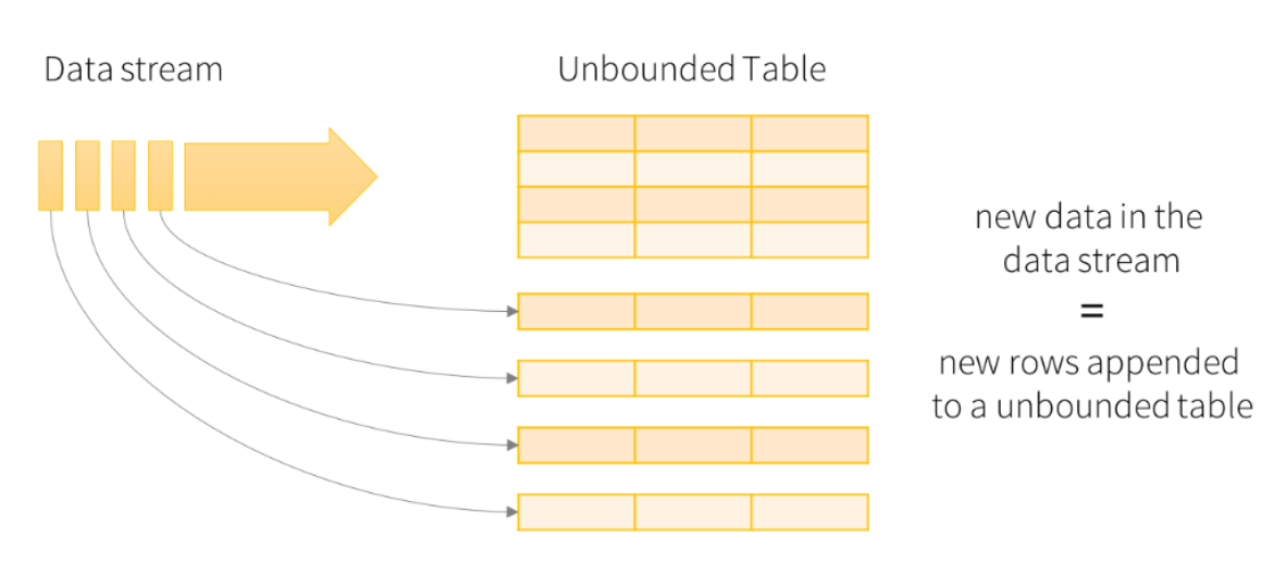 Structured Streaming将实时数据当做被连续追加的表。流上的每一条数据都类似于将一行新数据添加到表中。