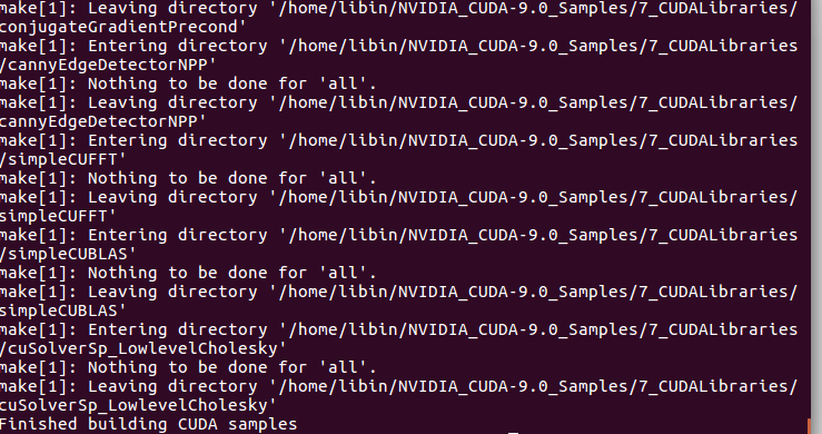 如果编译成功,最后会显示Finished building CUDA samples,如下图所示。