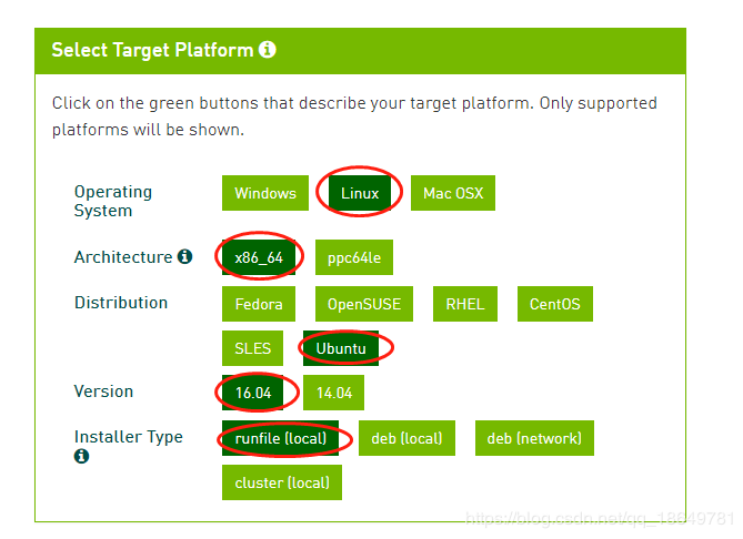 在相应提供的下载链接的界面,按照如下所标注的内容进行:(我本人的是 Ubuntu服务器,16.04的,在这里我们选择runfile的安装形式)