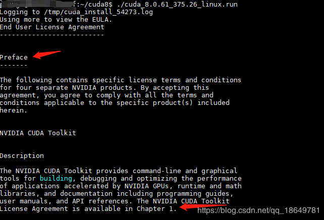 cd CUDA8 # 进入包含上述下载文件的文件夹 sudo chmod 777 cuda_8.0.61_375.26_linux.run ##给文件一定的权限 ./cuda_8.0.61_375.26_linux.run ## 开始安装