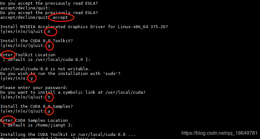 当你跳过了介绍文档之后,接下来会出现一些需要你选择的选项:(每一步对应的输入都在下图中用红色的圆圈标注出来了,在这里解释一点:Driver一定要选择 n,因为你之前有装的支持CUDA9.0的驱动,所以就不用在装新的)