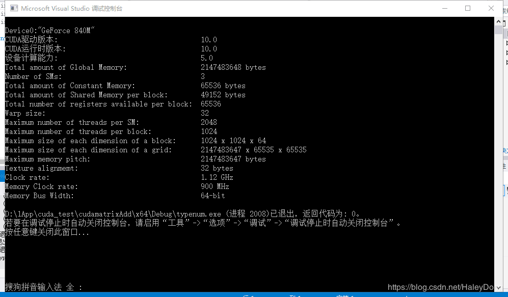 结果如下图,我们得到了本机的GPU硬件信息。注意:关注第二行计算能力,可以看到这台机器的计算能力是5.0。