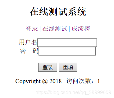 <center> <h2>在线测试系统</h2> <p> <a href="Index.jsp" rel="external nofollow" >登录</a> | <a href="test.jsp" rel="external nofollow" >在线测试</a> | <a href="scorelist.jsp" rel="external nofollow" >成绩榜</a> </p> </center>
