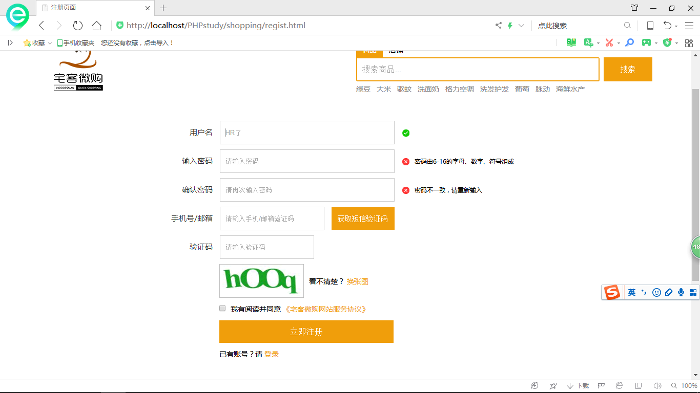 <div class="password-con registered"> <form action="regist.php" method="post"> <div class="psw"> <p class="psw-p1">用户名</p> <input type="text" name="username" placeholder="HR了" /> <span class="dui"></span> </div> <div class="psw"> <p class="psw-p1">输入密码</p> <input type="password" name="password" placeholder="请输入密码" /> <span class="cuo">密码由6-16的字母、数字、符号组成</span> </div> <div class="psw"> <p class="psw-p1">确认密码</p> <input type="password" name="repassword" placeholder="请再次输入密码" /> <span class="cuo">密码不一致,请重新输入</span> </div> <div class="psw psw2"> <p class="psw-p1">手机号/邮箱</p> <input type="text" name="telphone" placeholder="请输入手机/邮箱验证码" /> <button>获取短信验证码</button> </div> <div class="psw psw3"> <p class="psw-p1">验证码</p> <input type="text" placeholder="请输入验证码" /> </div> <div class="yanzhentu"> <div class="yz-tu f-l"> <img src="img/psw-yanzhengtu.gif" /> </div> <p class="f-l"> 看不清楚? <a href="#" rel="external nofollow" rel="external nofollow" rel="external nofollow" rel="external nofollow" >换张图</a> </p> <div style="clear: both;"></div> </div> <div class="agreement"> <input type="checkbox" name="hobby" /> <p> 我有阅读并同意 <span>《宅客微购网站服务协议》</span> </p> </div> <button type="submit" value="注册" class="psw-btn">立即注册</button> <p class="sign-in"> 已有账号?请 <a href="login.html" rel="external nofollow" >登录</a> </p> </form> </div><!-- 注册框结束 -->