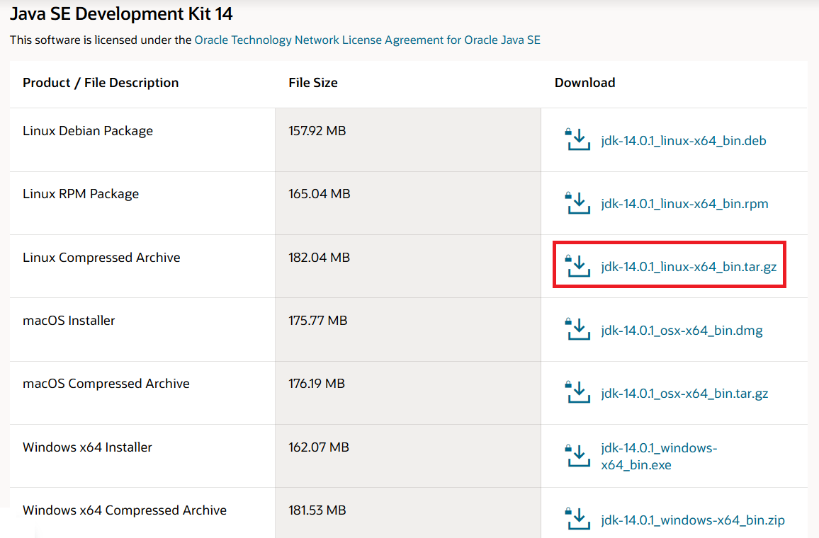 在下载页面中根据自己的系统选择对应的jdk版本,此处以Ubuntu 20.04 LTS(64bits)系统为例,选择压缩类型的jdk-14.0.1_linux-x64_bin.tar.gz进行下载。