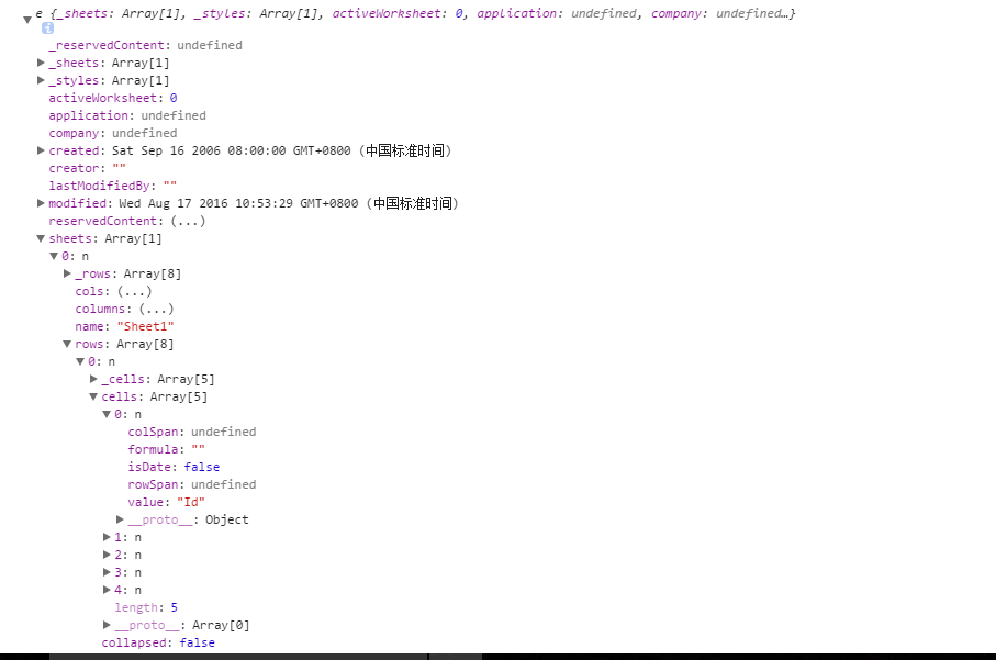 打印这个对象发现,workbook里面包含sheets数组,每个sheet包含rows数组,每个row包含cells数组,每个cell里面vaule属性就是单元格的值。