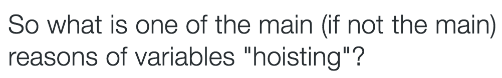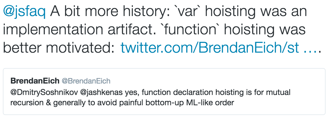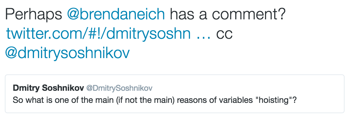 关于为什么进行变量提升和函数提升,这个问题一直没有明确的答案,不过最近读到Dmitry Soshnikov之前的一篇文章时,多少了解了一些,下面是Dmitry Soshnikov早些年的twitter,他也对这个问题十分感兴趣: