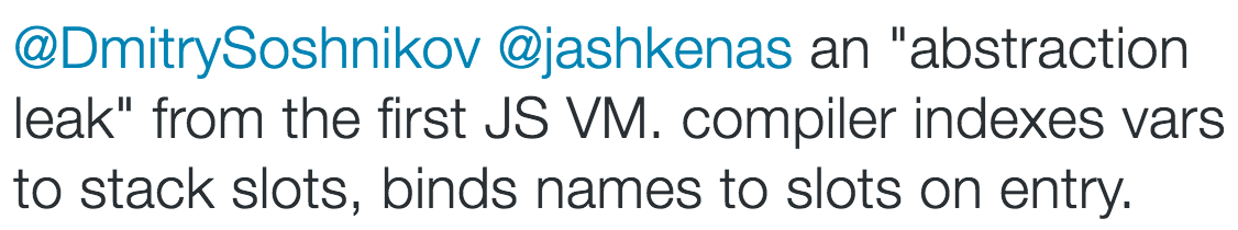 大致的意思就是:由于第一代JS虚拟机中的抽象纰漏导致的,编译器将变量放到了栈槽内并编入索引,然后在(当前作用域的)入口处将变量名绑定到了栈槽内的变量。(注:这里提到的抽象是计算机术语,是对内部发生的更加复杂的事情的一种简化。)