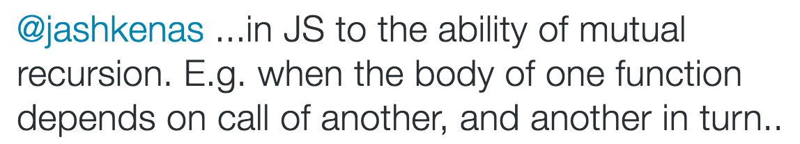 然后,Dmitry Soshnikov又提到了函数提升,他提到了相互递归(就是A函数内会调用到B函数,而B函数也会调用到A函数):