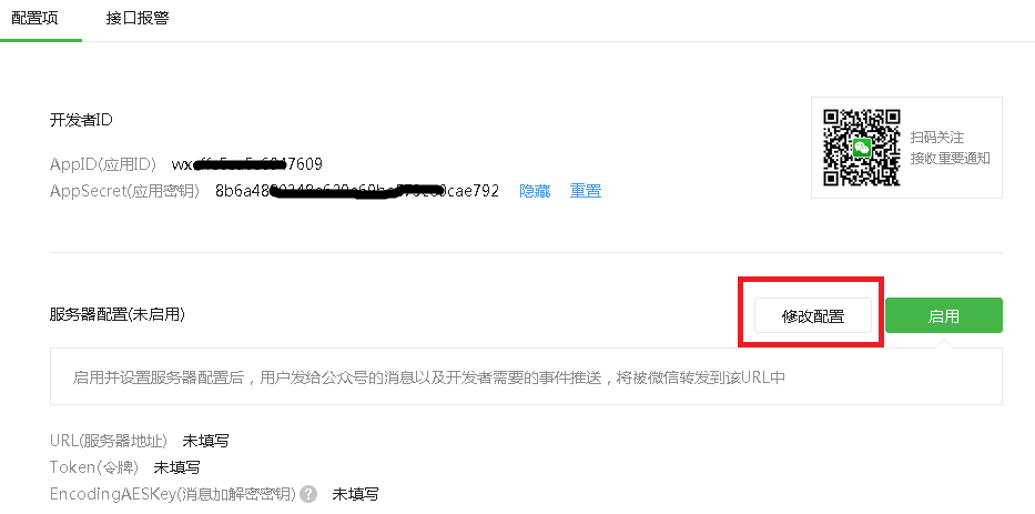 菜单配置要知道开发者ID中的AppID(这个可以直接看到)和AppSecret(这个有可能是被隐藏的,要通过公众号管理员验证通过申请查看才能显示完整,显示完整后要及时保存记录,这样下次就不用再找管理员了)。