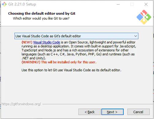 第四步:选择默认编辑器,我日常使用Vscode作为编辑器,勾选使用 Visual Studio Code 作为 Git 的默认编辑器,点击[next]