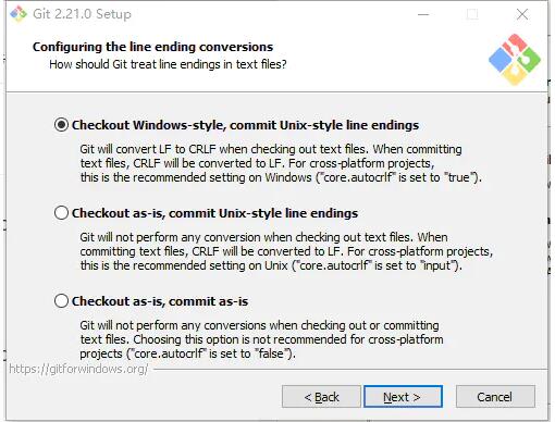 选项一,选项让Git能够自动转换文件中的换行符;签出到本地时转换为Windows下的换行符,提交到服务器时转换为Unix下的换行符