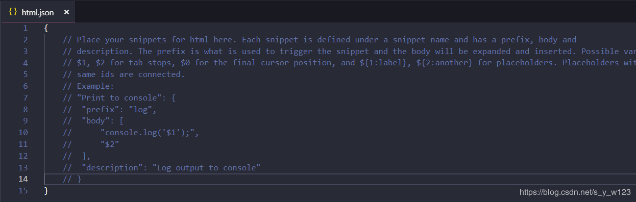 • 千万别把Vscode中html.json文件自带的{}覆盖了,只需覆盖注释部分,或直接写到注释下面即可。