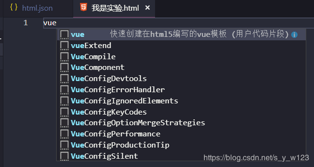 保存之后,我们创建一个.html文件,输入vue,回车即可自动生成我们需要的模板了。模板示例图: