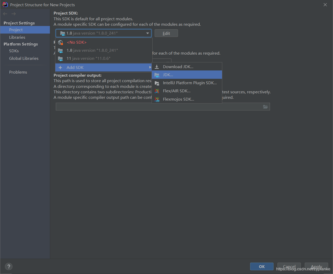 如下图,进入设置菜单 Project Structure | Project Settings | Project 中选择默认的JDK。(建议选本电脑已经安装的JDK)。 设置后需要点“Apply”按钮生效。