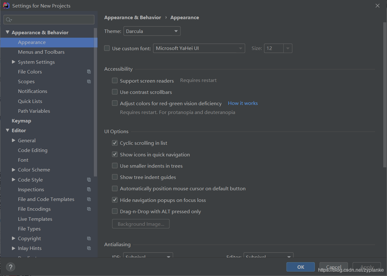 如下图,进入设置菜单Settings | Appearance & Behavior | Appearance 选择主题。设置后需要点“Apply”按钮生效。