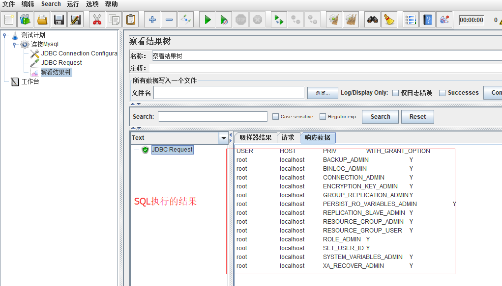 3、在添加一个Sampler:JDBC Request,顺手加个结果树。