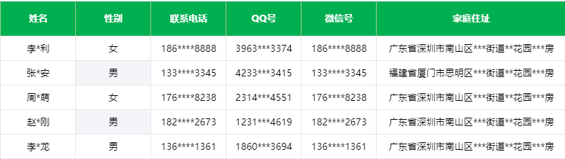 在日常开发中,身份证号、手机号、卡号、客户号等个人信息都需要进行数据脱敏。否则容易造成个人隐私泄露,客户资料泄露,给不法分子可乘之机。但是数据脱敏不是把敏感信息隐藏起来,而是看起来像真的一样,实际上不能是真的。我以前的公司就因为不重视脱敏,一名员工在离职的时候通过后台的导出功能导出了核心的客户资料卖给了竞品,给公司造成了重大的损失。当然这里有数据管理的原因,但是脱敏仍旧是不可忽略的一环,脱敏可以从一定程度上保证数据的合规使用。下面就是一份经过脱敏的数据:
