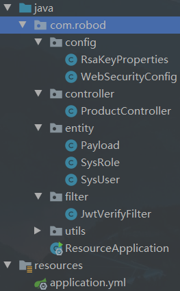 在这一小节,我们要实现去访问资源服务器中的资源,并进行鉴权的操作。在父工程SpringSecirityDemo中再创建一个模块recourse_server。因为我们现在并不需要从数据库中获取用户信息。所以就不需要自己去定义Service和Mapper了。也不需要登录的过滤器了。下面这张目录结构图是资源服务工程所需要的所有东西。