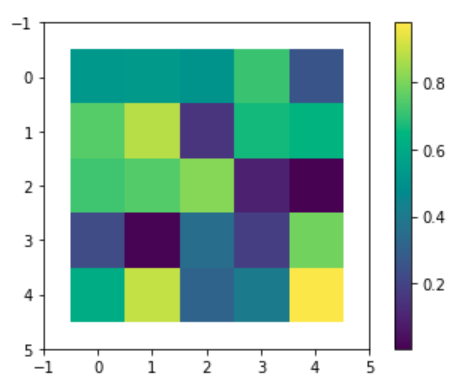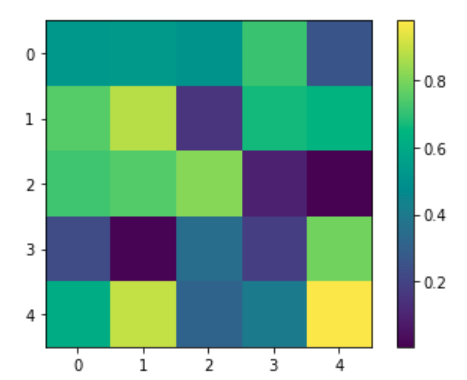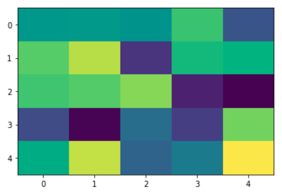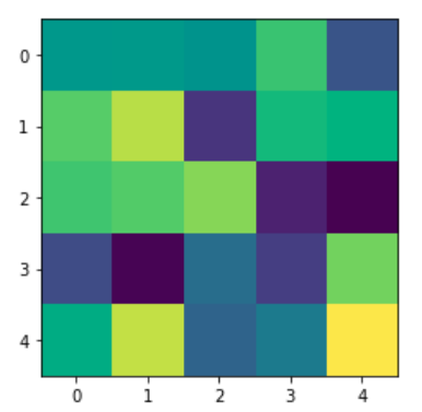 import matplotlib.pyplot as plt import numpy as np np.random.seed(123456789) data = np.random.rand(25).reshape(5, 5) plt.imshow(data)