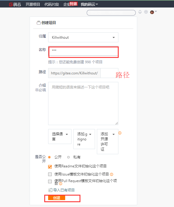 在一些代码托管平台创建项目,例如github或者开源中国社区,这里已开源中国社区为例;