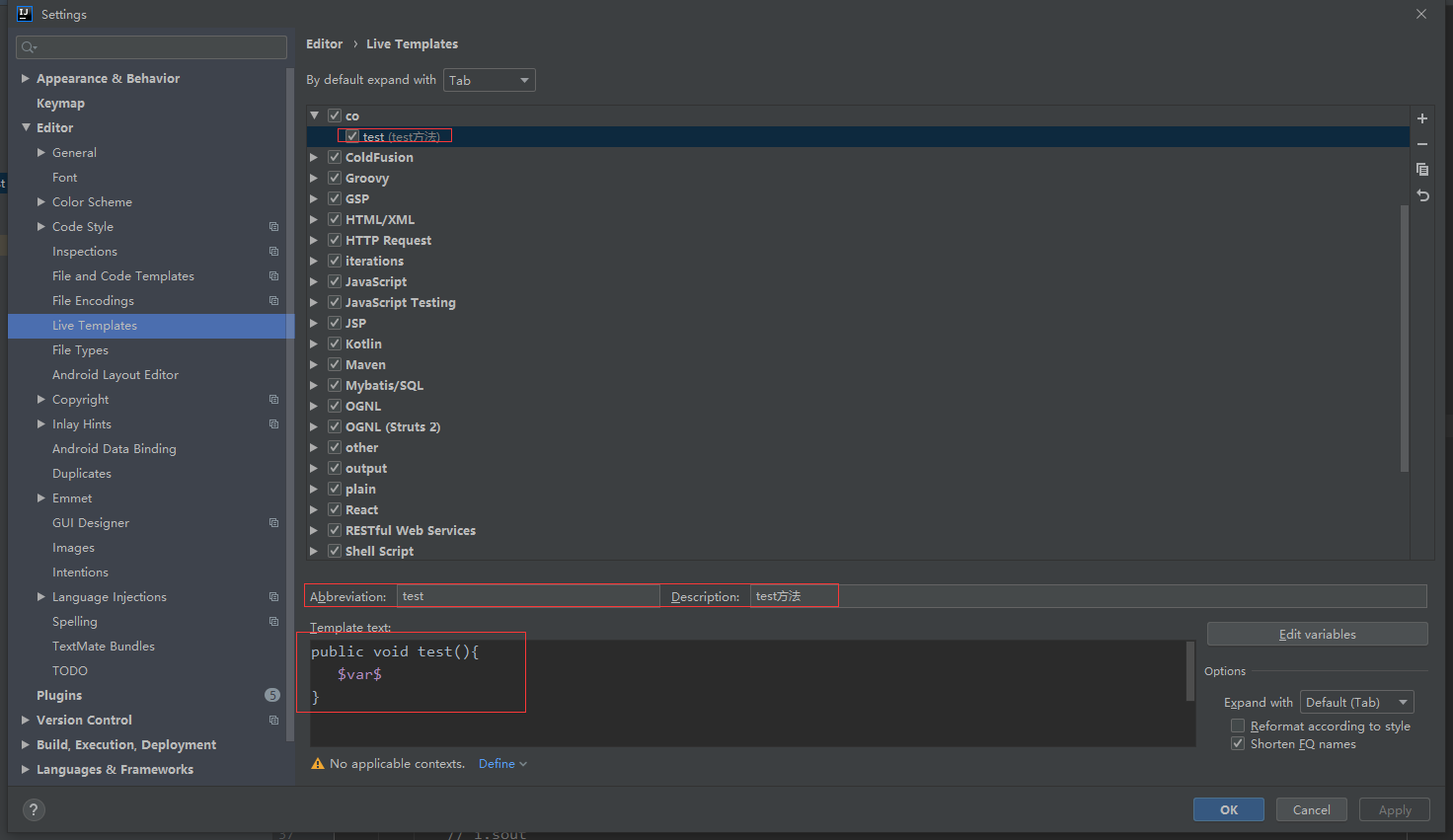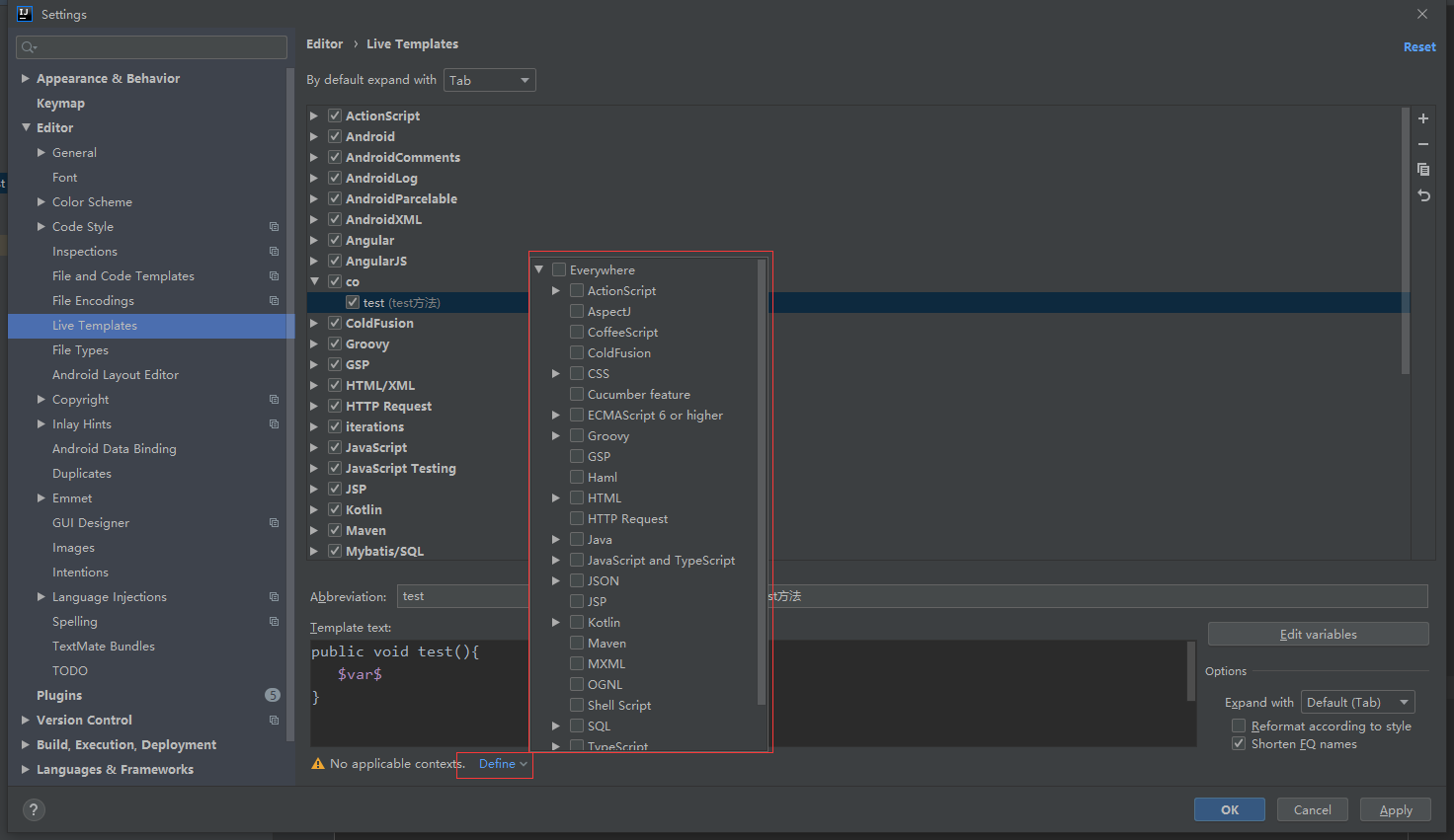 点击define,选择应用范围(没有此步骤,模板不生效),这里选择Java,则勾选Java