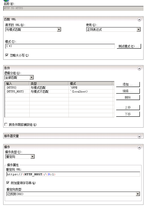 添加条件: 条件: {HTTPS} 模式: off