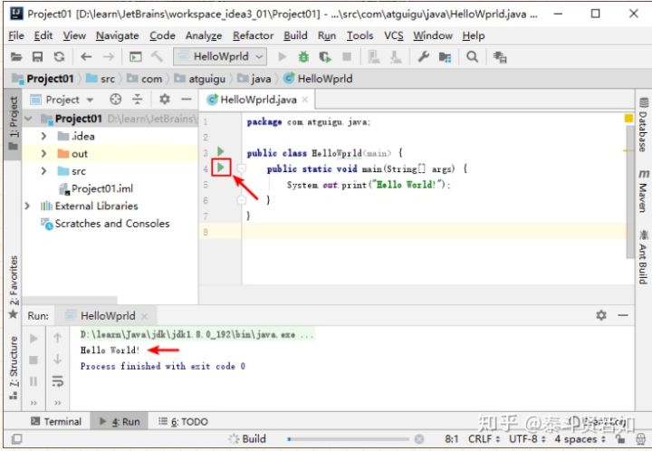 不管是创建 Class,还是 Interface,还是 Annotation,都是选择 New --> Java Class,然后在 Kind 下拉框中选择创建的结构的类型。接着在类 HelloWorld 里声明主方法,输出 Hello World!,完成测试