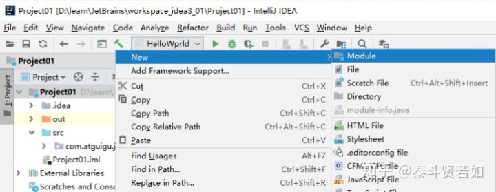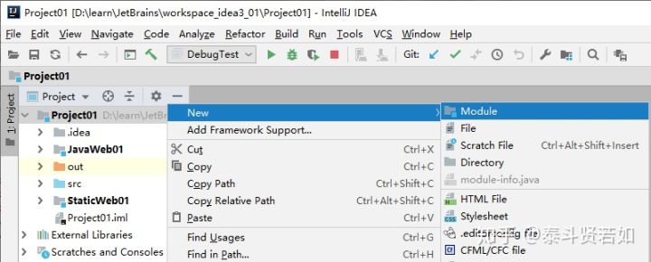 之后,我们可以在 Module 的 src 里写代码,此时 Project01 工程下的 src 就没什么