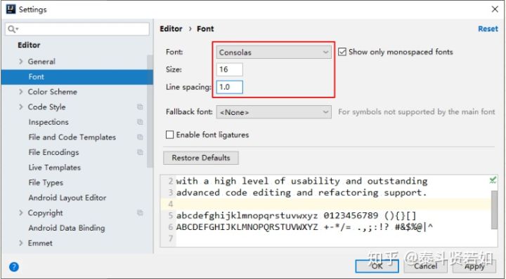 IntelliJ IDEA 的代码提示和补充功能有一个特性:区分大小写。如上图标注所示,默认就是 First letter only 区分大小写的。区分大小写的情况是这样的:比如我们在 Java 代码文件中输入 stringBuffer,IntelliJ IDEA - 默认是不会帮我们提示或是代码补充的,但是如果我们输入StringBuffer 就可以进行代码提示和补充。如果想不区分大小写的话,取消勾选该选项即可。(2017版本的IEDA中是改为 None 选项)设置默认的字体、字体大小、字体行间距