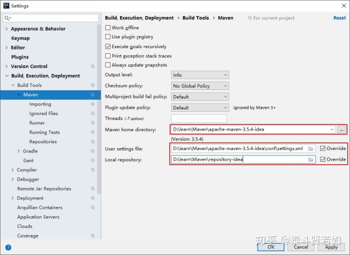 - Maven home directory:可以指定本地 Maven 的安装目录所在,因为我已经配置了 MAVEN_HOME 系统参数,所以直接这样配置 IntelliJ IDEA 是可以找到的。但是假如你没有配置的话,这里可以选择你的 Maven 安装目录。此外,这里不建议使用 IDEA 默认的。